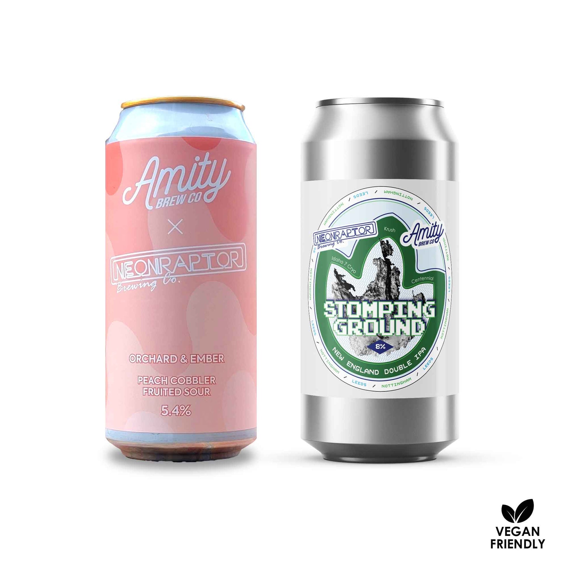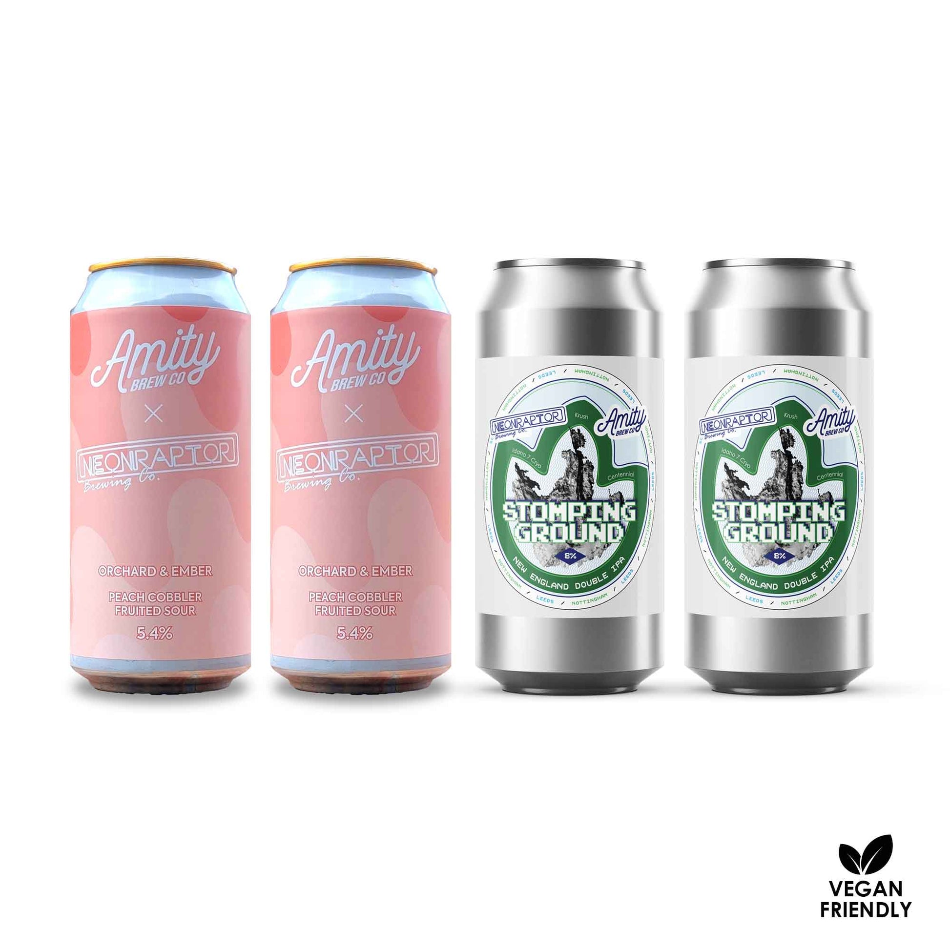 Discover the taste of Neon Raptor and Amity in one simple pack. Expect big flavours from a New England double IPA and a peachy fruited sour.